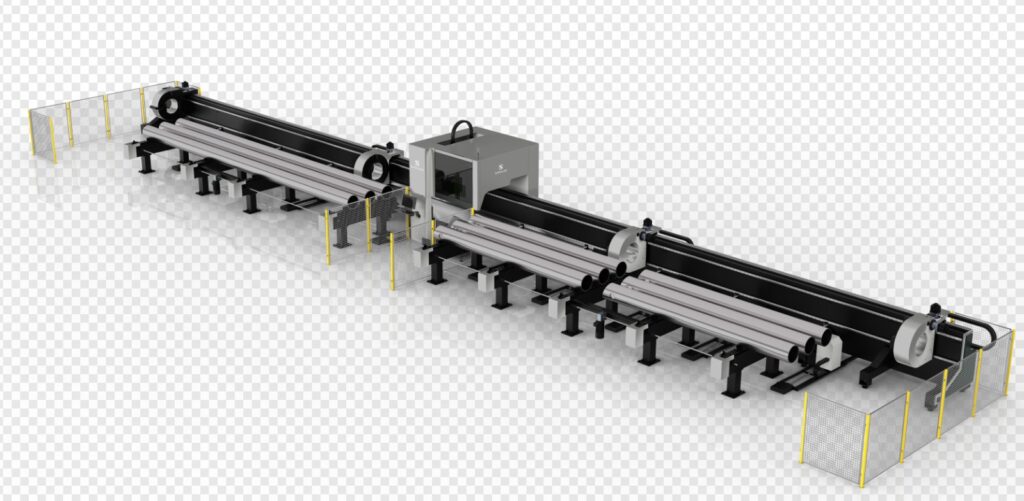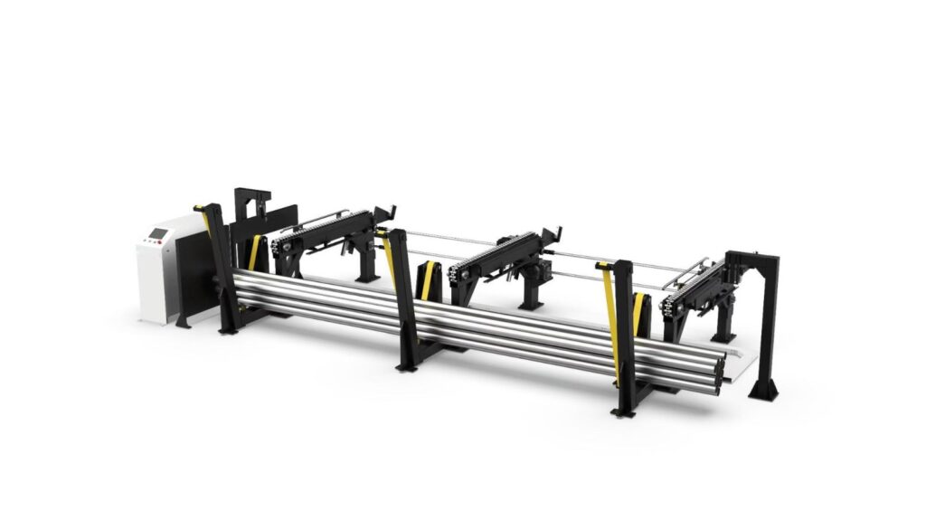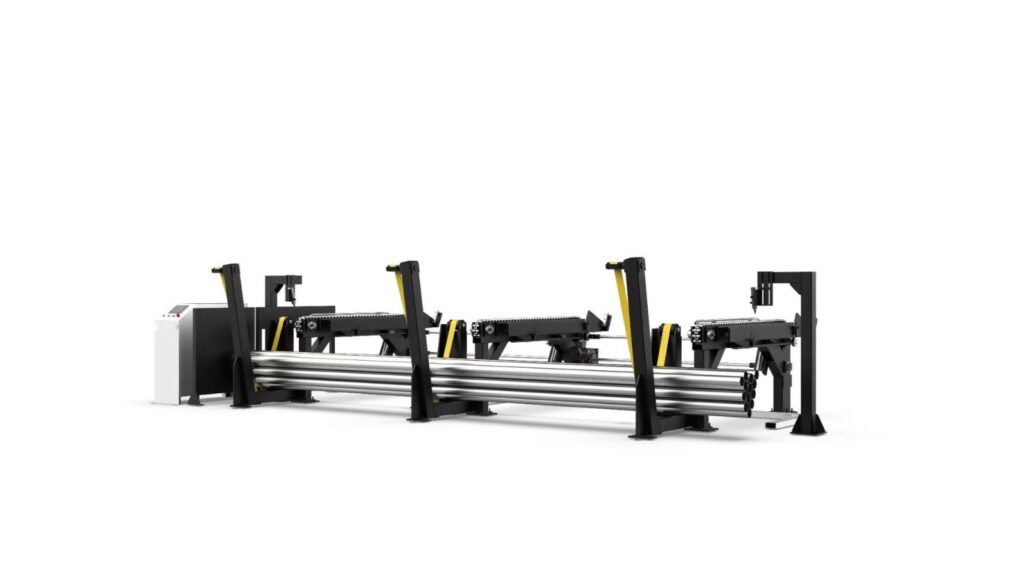 - Système de Chargement Automatique : C’est l’option la plus importante pour la production en série. Il permet le chargement à grande vitesse de faisceaux entiers de tubes (ronds, rectangulaires, et parfois profilés ouverts) vers la machine. Il réduit le temps de manipulation et la dépendance à l’opérateur, assurant une cadence élevée sur des barres jusqu’à 12 mètres.